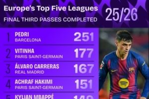 五大联赛进攻三区完成传球数:佩德里断档领先,皇马4人进前十